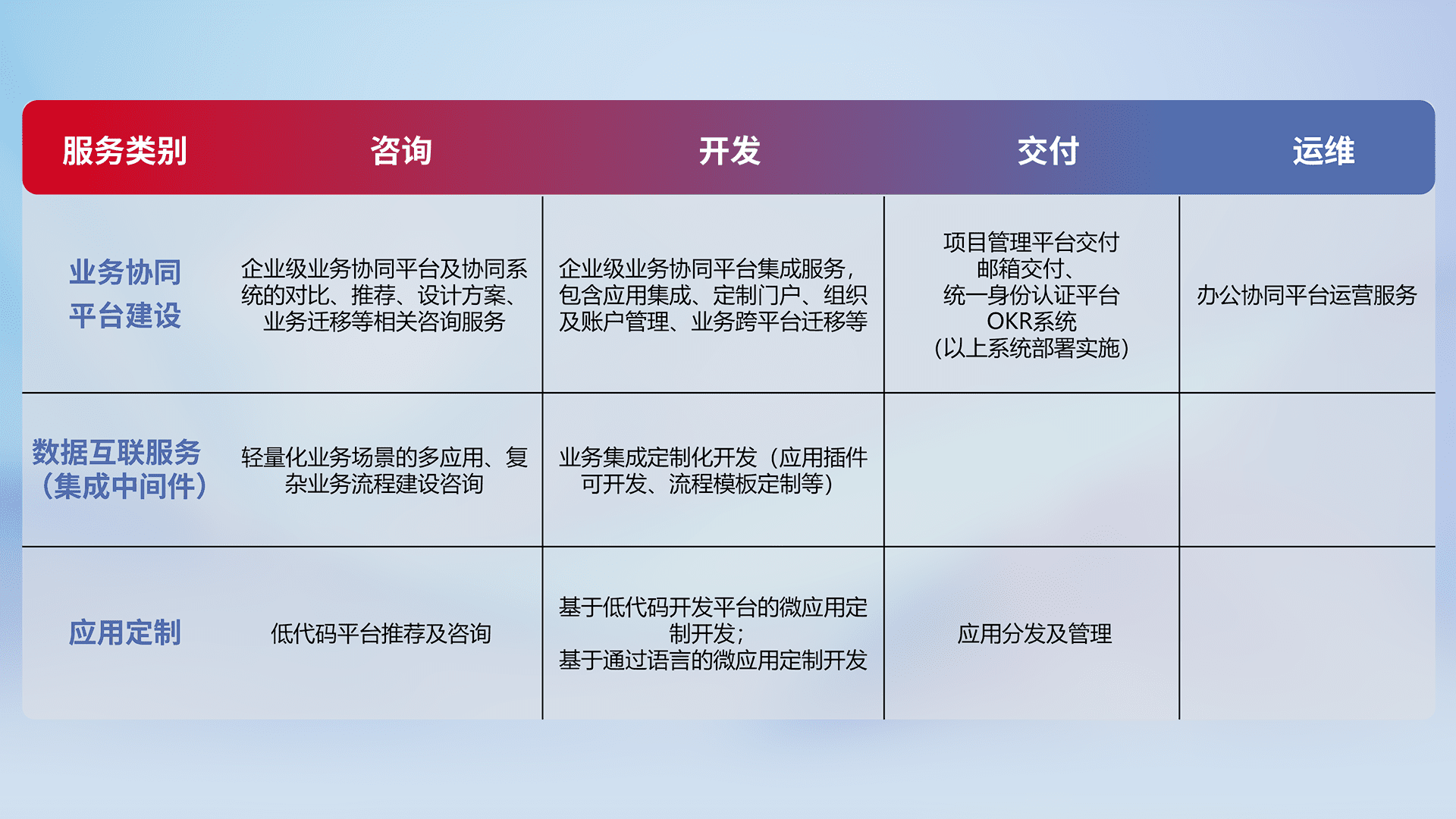 针对钉钉、、、、企微、、IDaas等平台级产品提供产品的规划、、方案、、、、交付、、、、定制化开发等服务,,,,实现如统一协同办公、、智能客户服务、、、、混合会议管理、、、、智能数据查询、、、等业务场景,,实现数字化转型。。。。