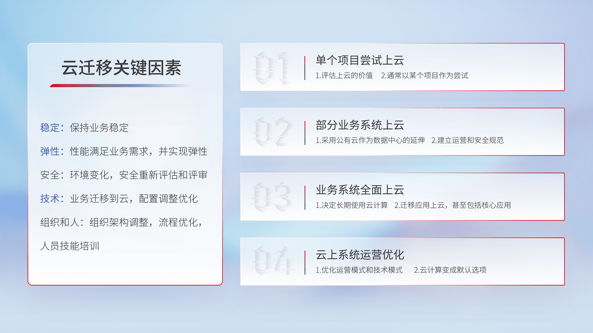 结合实际业务,,从规划设计、、云平台选型、、、云原生改造、、数据迁移、、、、集成交付,,,迁移全过程为客户识别最佳上云路径,,做好风险识别管理,,设计网络架构、、身份权限、、安全审计合规、、、、操作审计、、日志审计、、、监控告警策略、、、多站点容灾设计等,,,对云上基础设施进行整体规划,,,,提升IT治理水平,,,以满足弹性、、、、高可用、、高性能的需求。。。